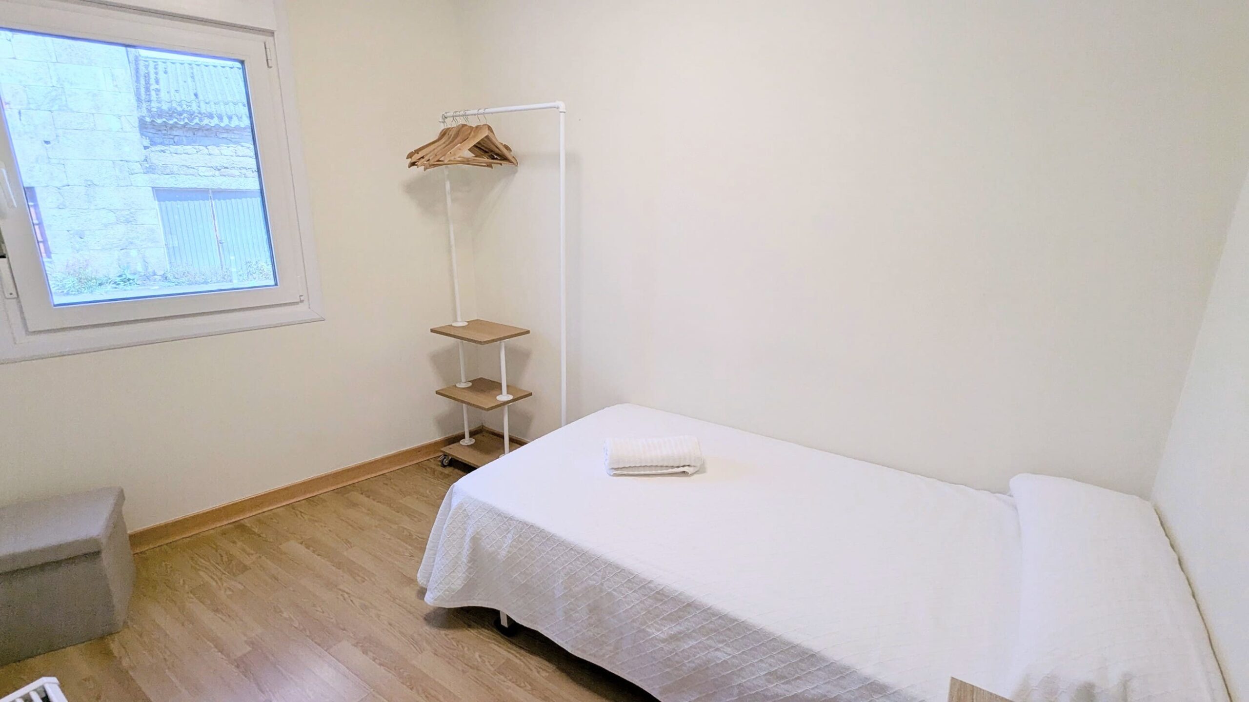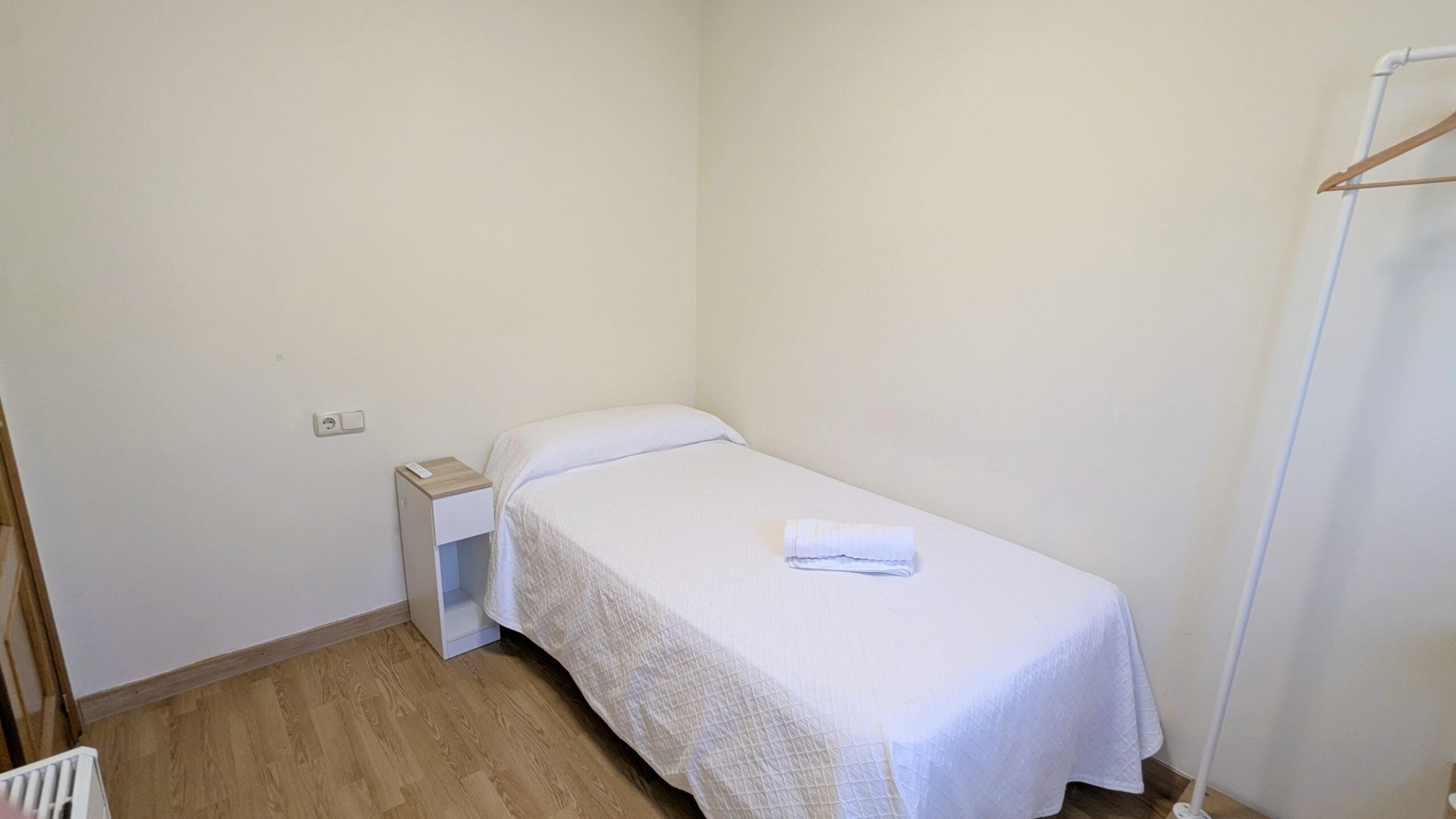 Es una habitación con una cama y un escritorio. Tiene un pequeño armario. Las gemelas con camas individuales de 105cm, mesita de noche, burro y cajón.
